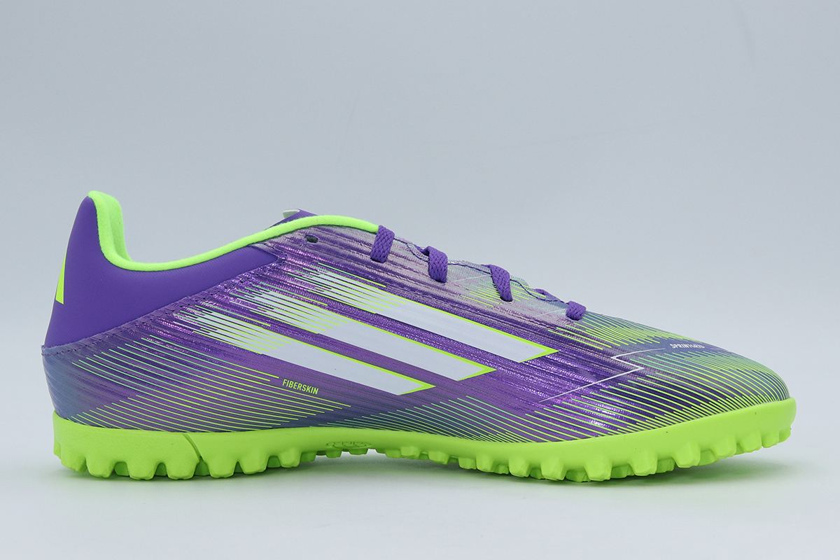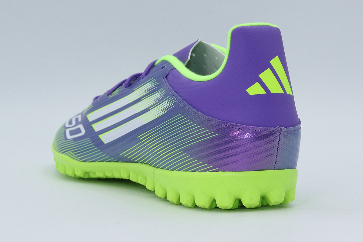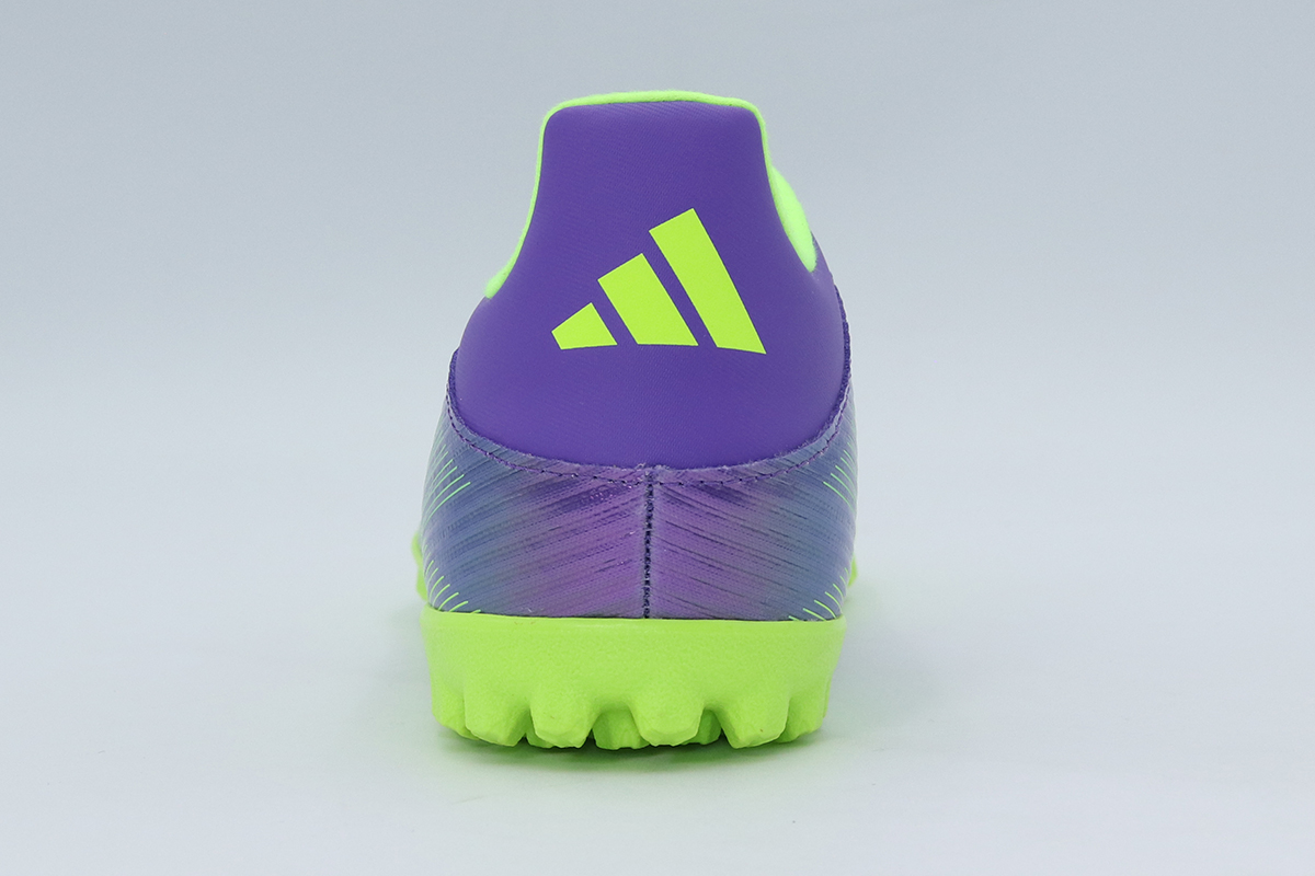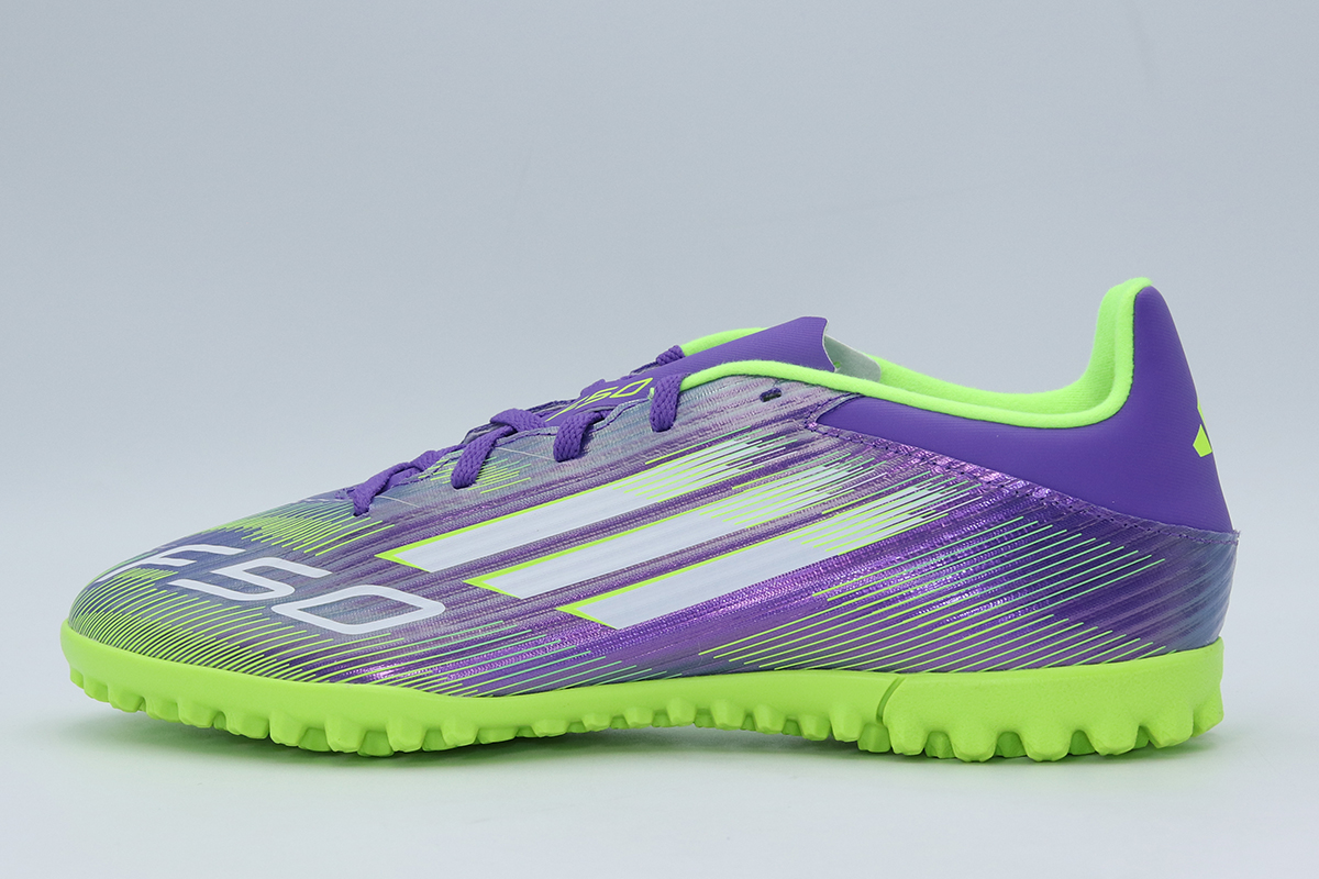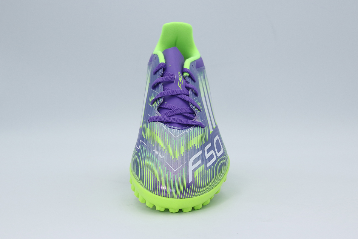 Ανέβασε το παιχνίδι σου σε άλλο επίπεδο με τα Adidas Performance F50 Club Turf ανδρικά ποδοσφαιρικά παπούτσια με σχάρα σε μωβ, λαχανί και λευκό χρώμα.