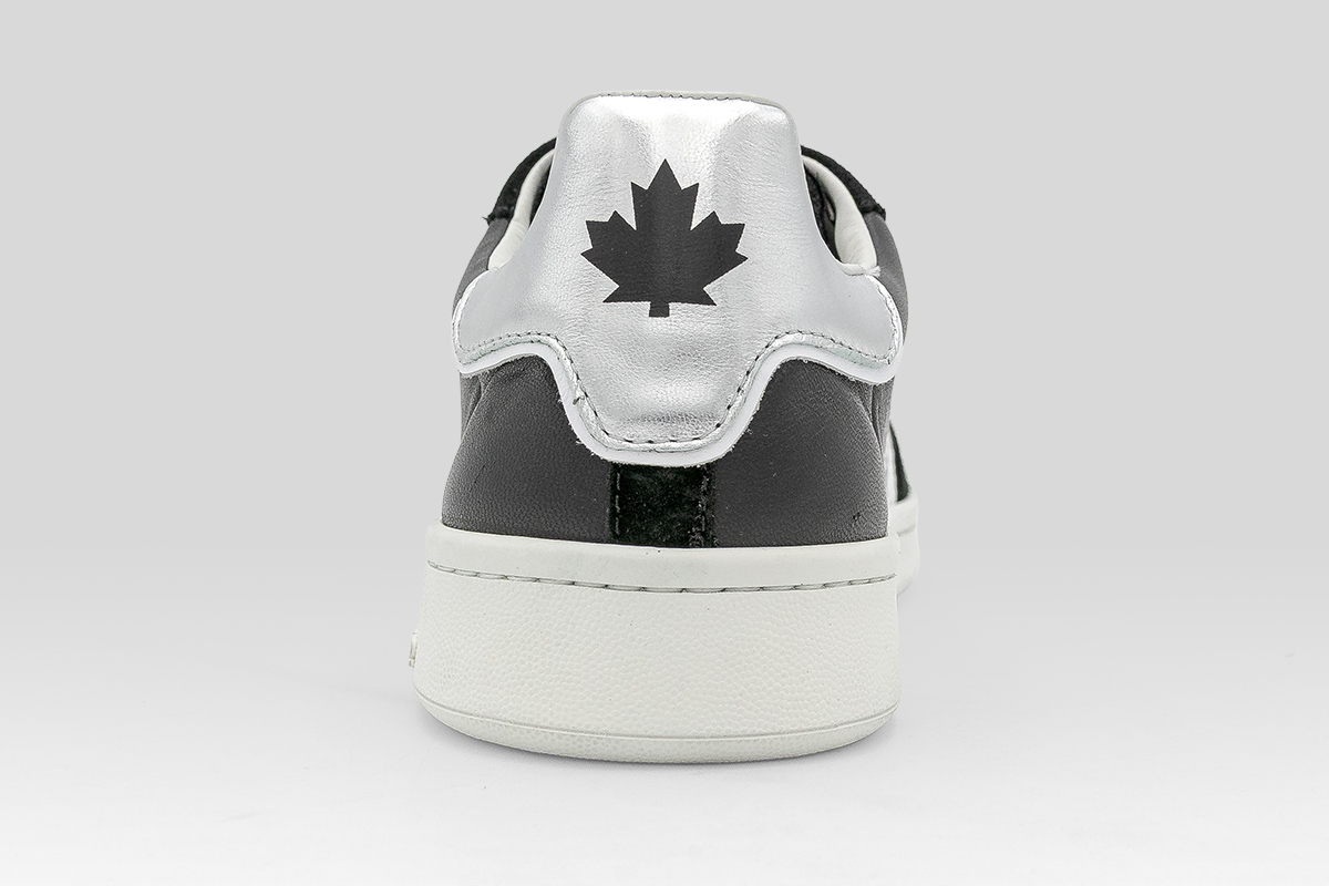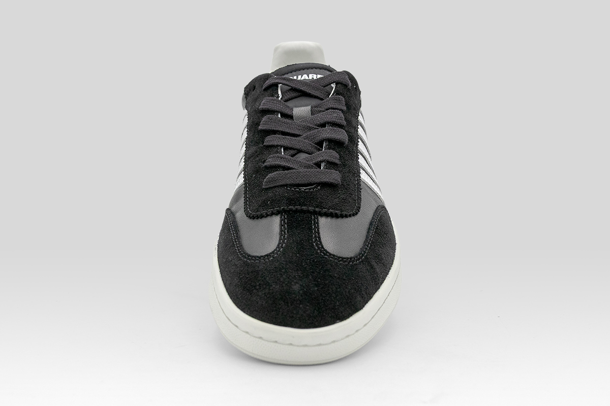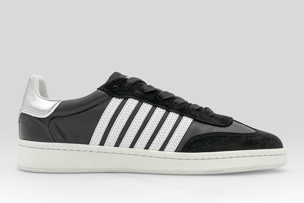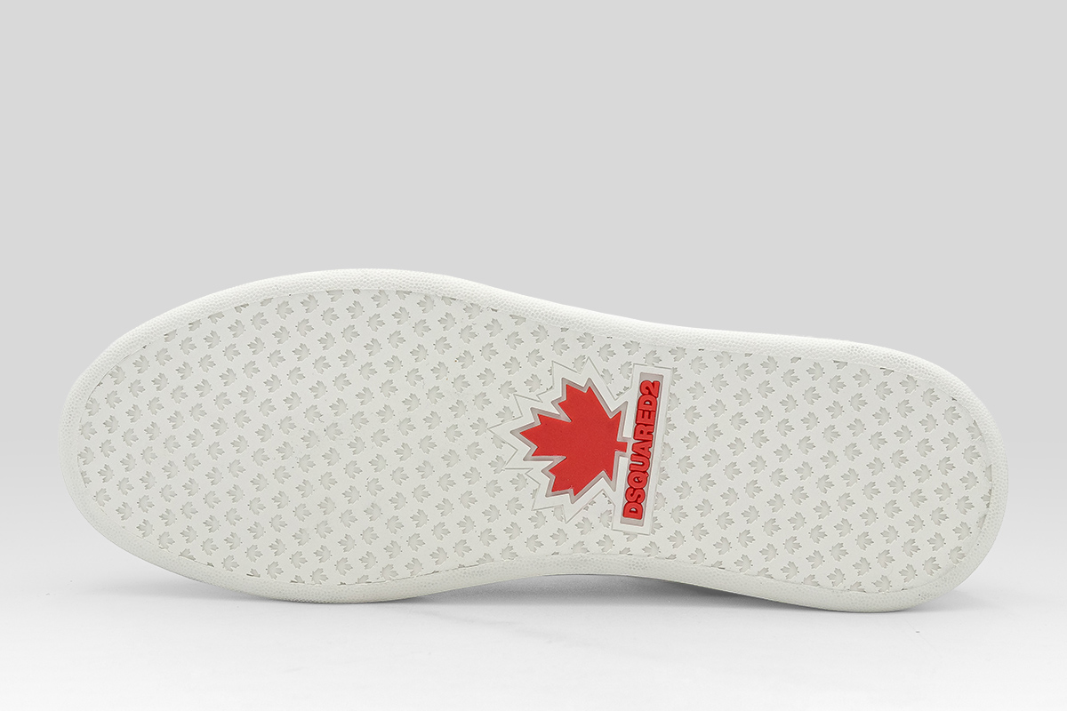 Η αντίθεση της επίπεδης σόλας δίνει μοντέρνο look, ενώ οι χαρακτηριστικές λοξές ταινίες στα πλαϊνά και η εμβληματική υπογραφή Dsquared2 στο εξωτερικό πάνελ αναδεικνύουν τη μοναδική ταυτότητα του brand.
