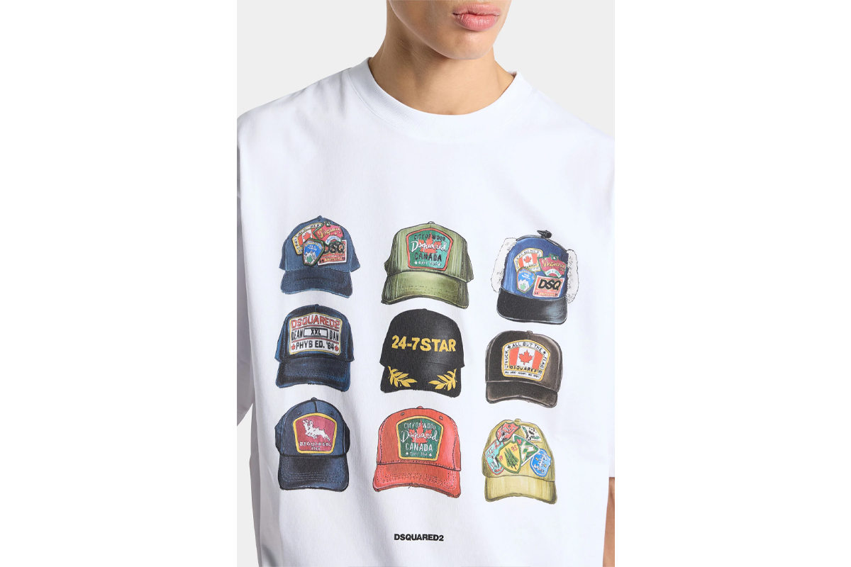 Η στάμπα με καπέλα στο μπροστινό μέρος λειτουργεί ως βασικό στοιχείο του σχεδιασμού, αναδεικνύοντας τη σύγχρονη ταυτότητα της Dsquared2 και δίνοντας χαρακτήρα στο σύνολο.