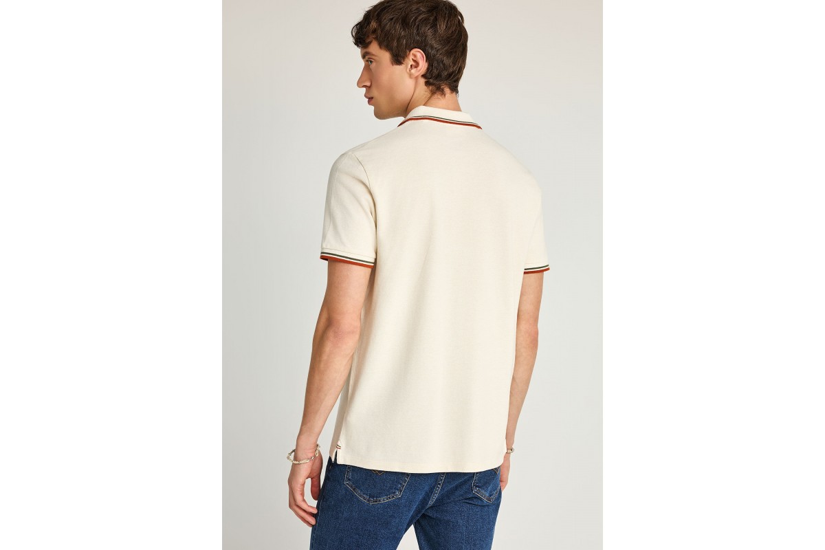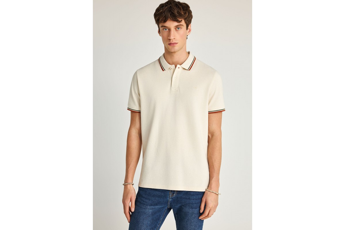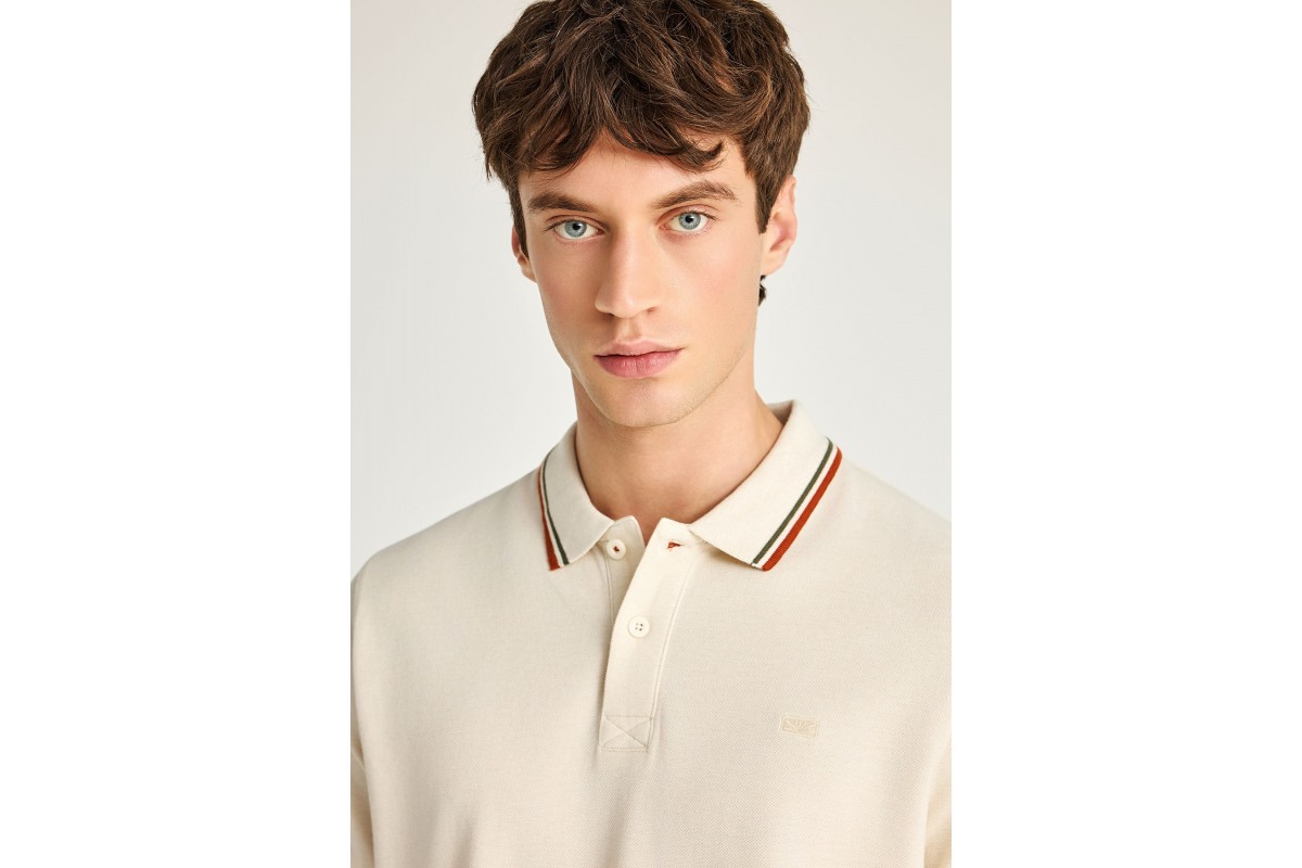 Η κανονική εφαρμογή εξασφαλίζει σωστή εφαρμογή και ελευθερία κινήσεων, ενώ ο polo γιακάς με ρίγες προσθέτει μια διακριτική αλλά κομψή λεπτομέρεια.