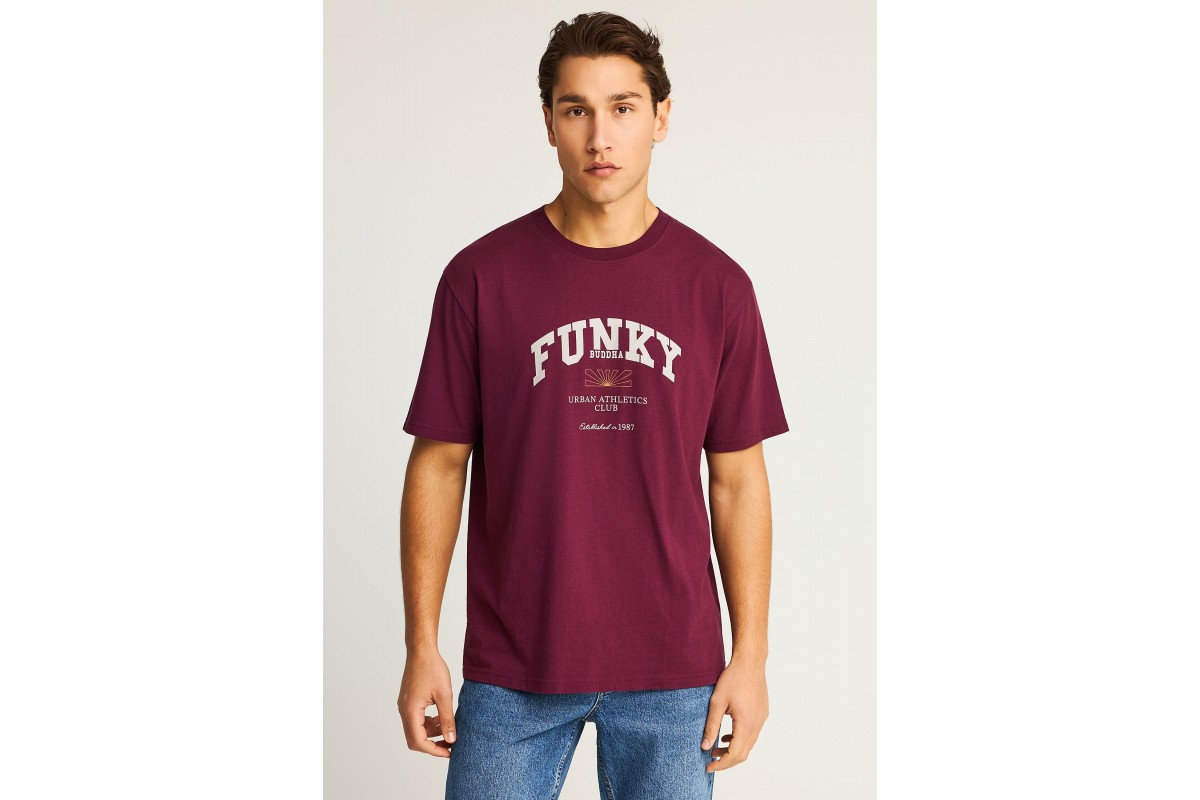 Το Funky Buddha ανδρικό κοντομάνικο T-shirt σε μπορντό χρώμα αποτελεί μια σταθερή επιλογή για κάθε εποχή, ιδανική για casual εμφανίσεις με χαρακτήρα.