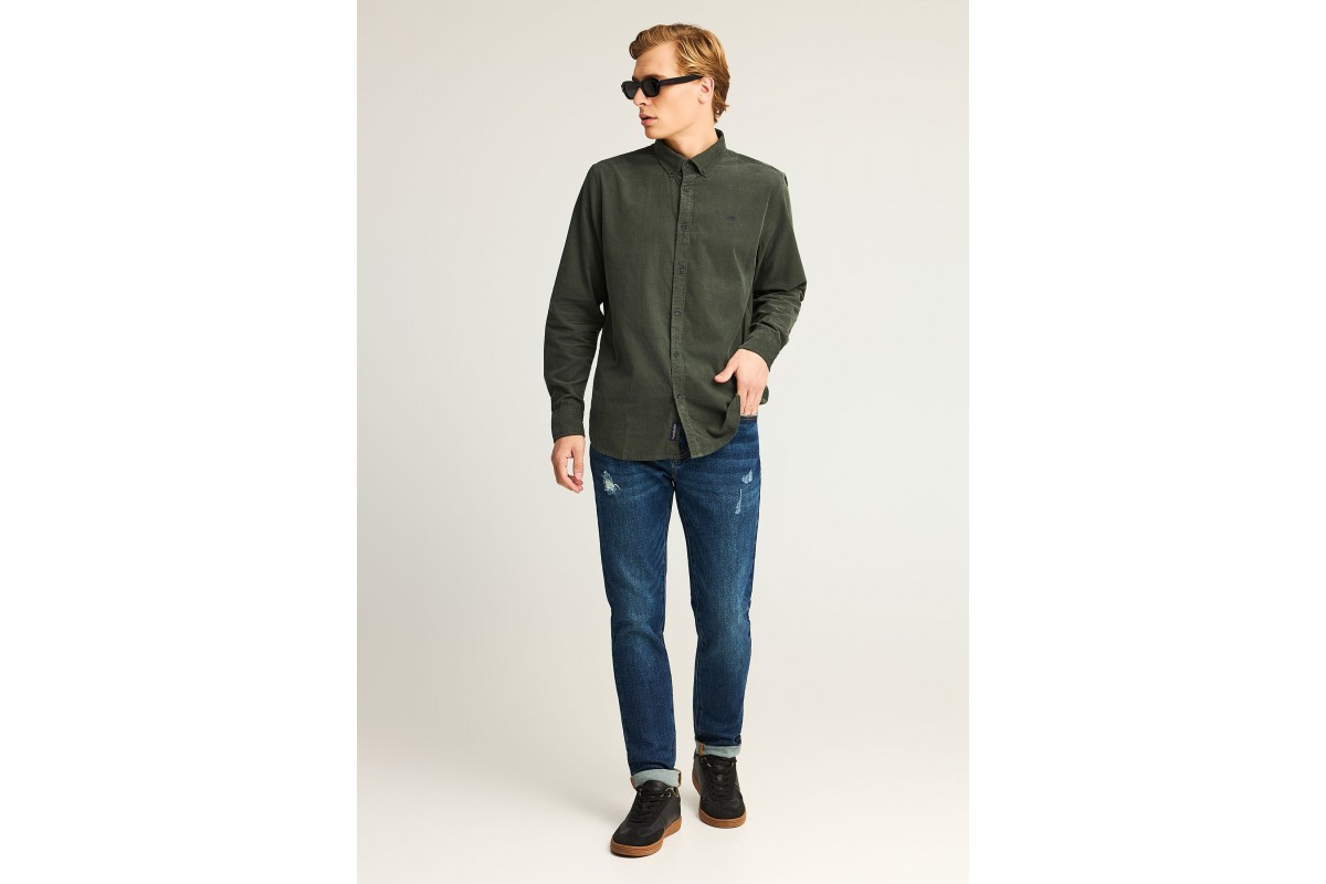 Το Funky Buddha ανδρικό πουκάμισο κοτλέ σε χακί χρώμα είναι μια επιλογή που συνδυάζει αυθεντικότητα και κομψότητα για τις πιο δροσερές μέρες.