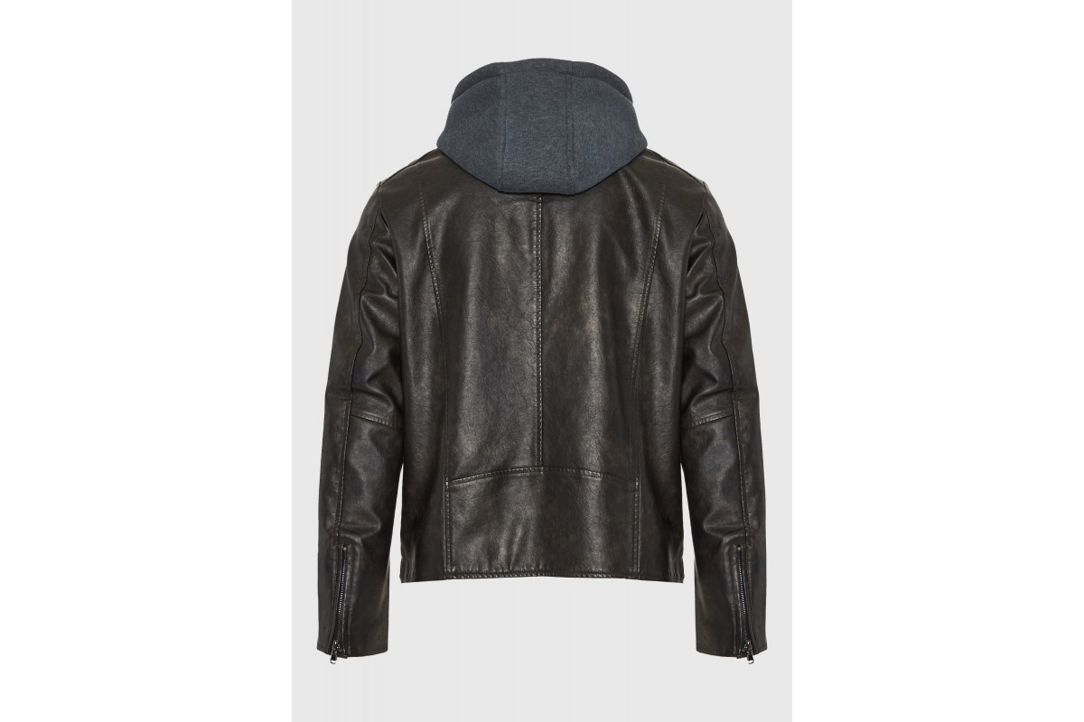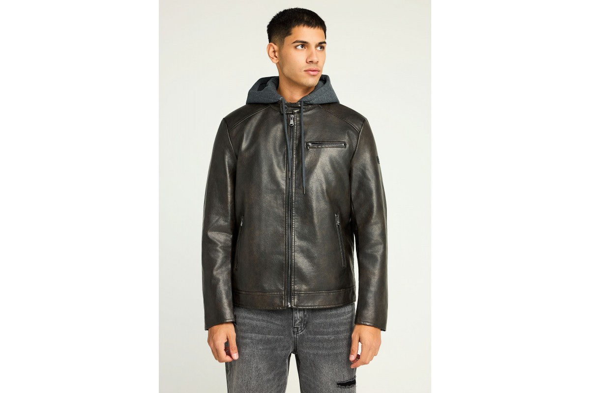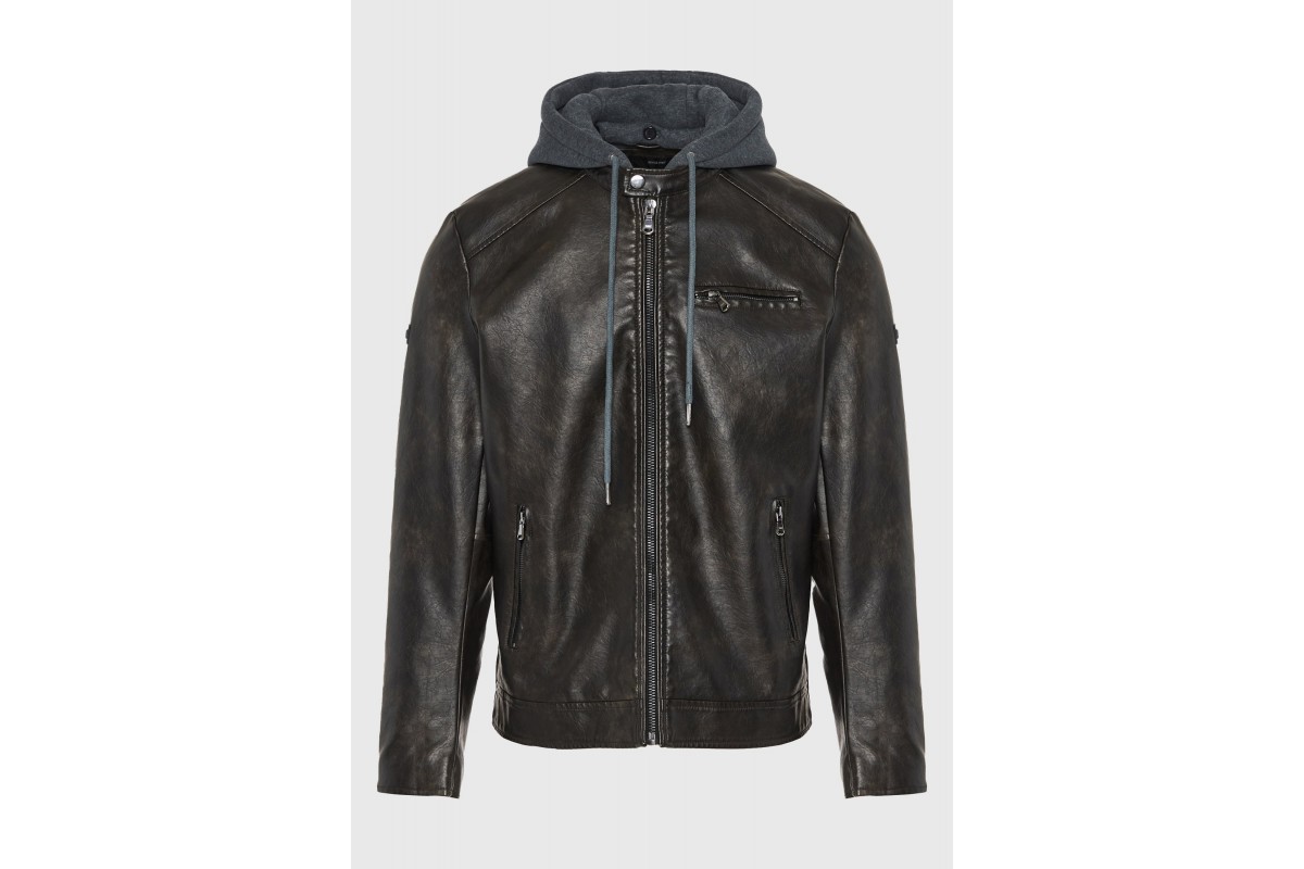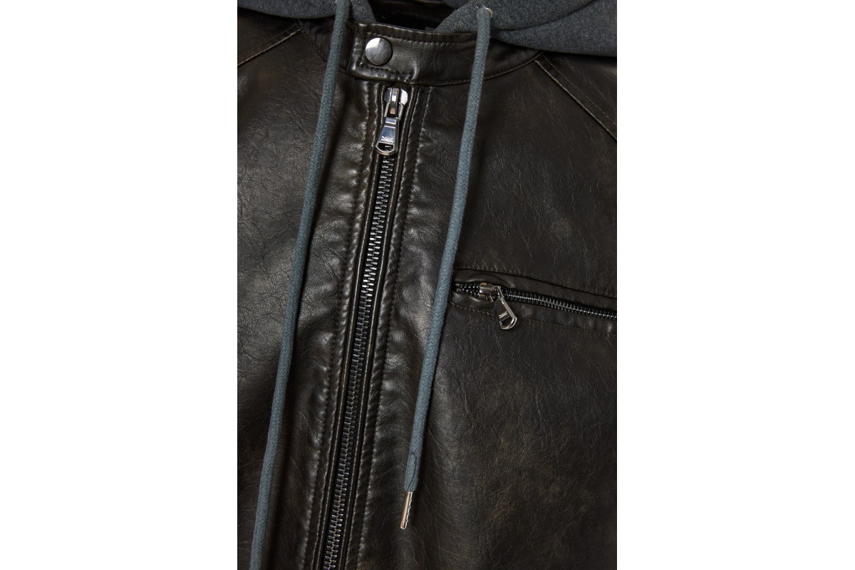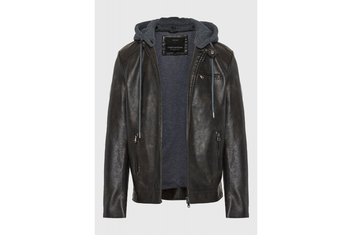 Funky Buddha Ανδρικό Biker Μπουφάν Δερματίνη με Κουκούλα Καφέ