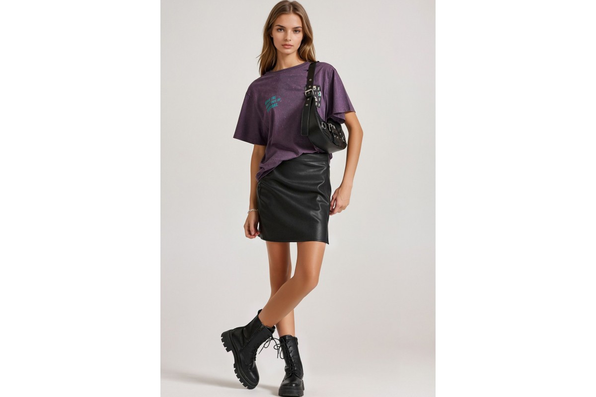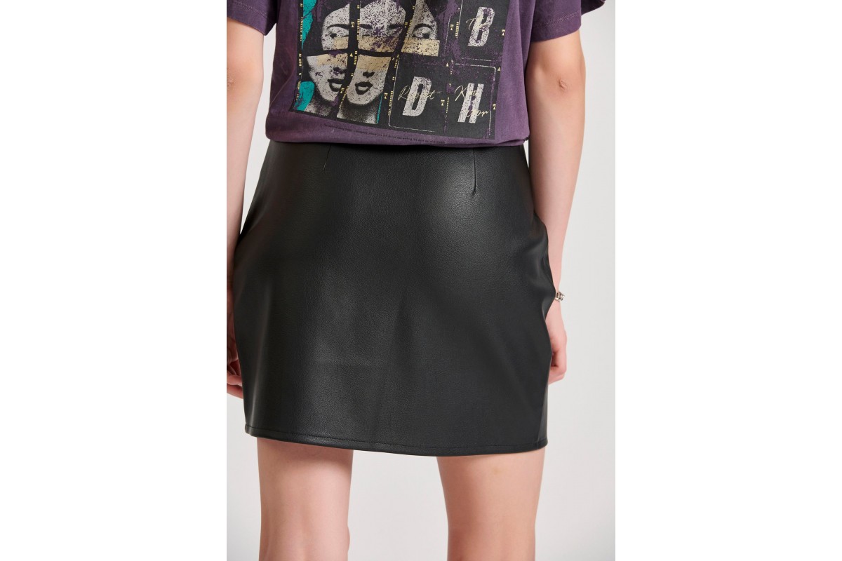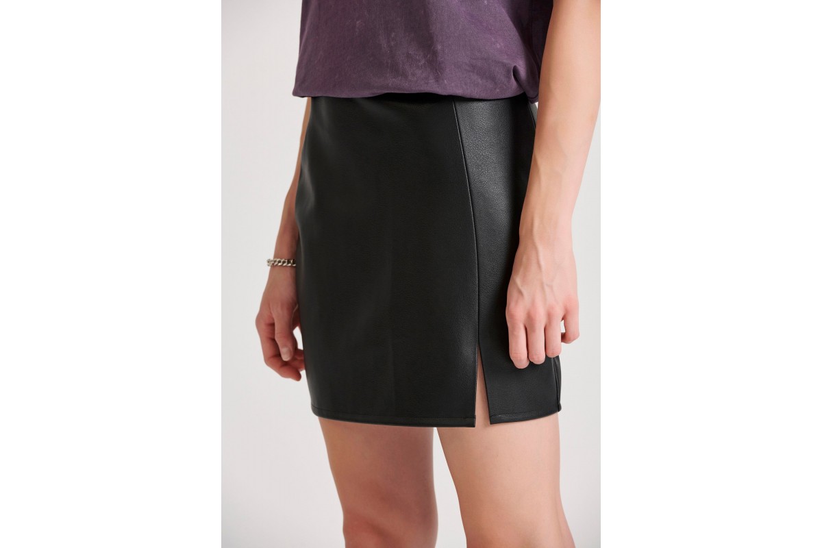 Το οικολογικό δέρμα της φούστας προσφέρει μία γυαλιστερή εμφάνιση που κλέβει τις εντυπώσεις, ενώ το μονόχρωμο σχέδιο σου δίνει τη δυνατότητα για ατελείωτους συνδυασμούς με tops και αξεσουάρ.