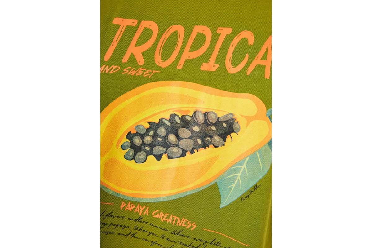 Το τύπωμα στο στήθος προσθέτει μια ζωηρή πινελιά, ενώ οι αποχρώσεις πράσινου, κίτρινου και πορτοκαλί δημιουργούν ένα ξεχωριστό καλοκαιρινό αποτέλεσμα που τραβάει τα βλέμματα.