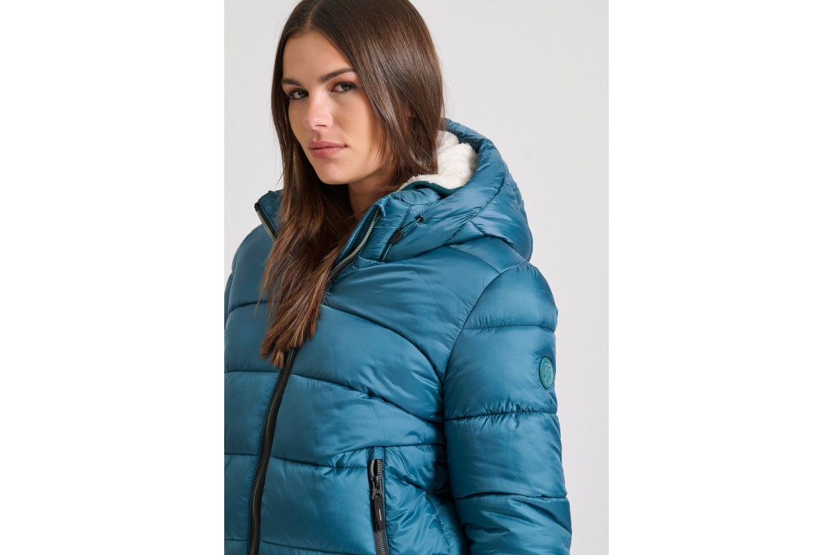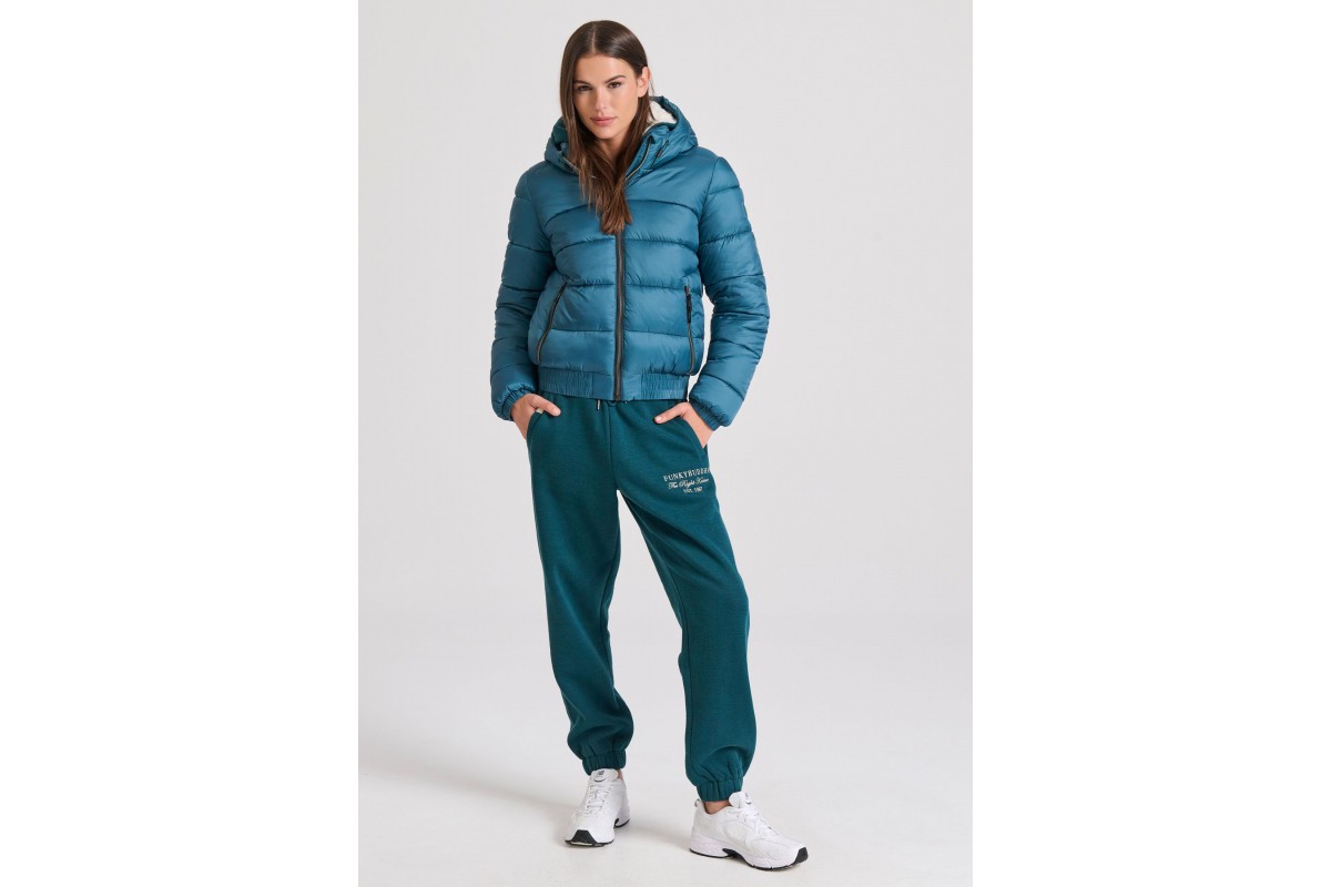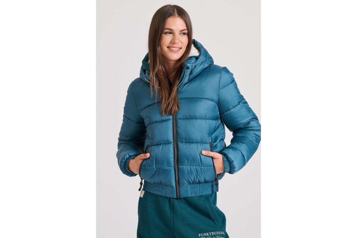 Το Funky Buddha γυναικείο καπιτονέ puffer μπουφάν σε πετρόλ χρώμα είναι η ιδανική επιλογή για να παραμένεις ζεστή και κομψή στις κρύες μέρες του χειμώνα.