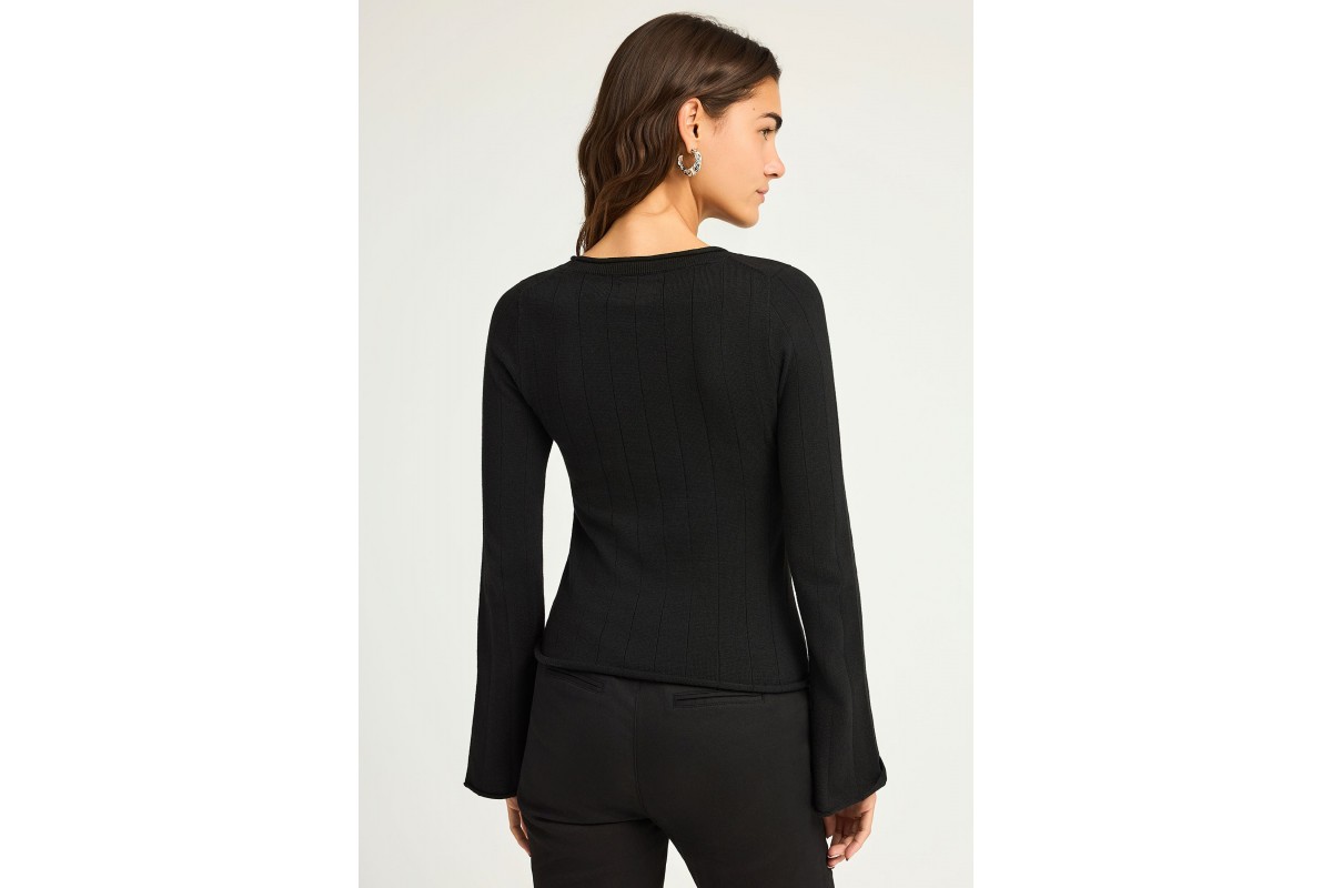 Το μακρύ μανίκι που ανοίγει σε καμπάνα (flared cuffs) προσθέτει μια εντυπωσιακή, retro λεπτομέρεια που κάνει την εμφάνισή σου να ξεχωρίζει.