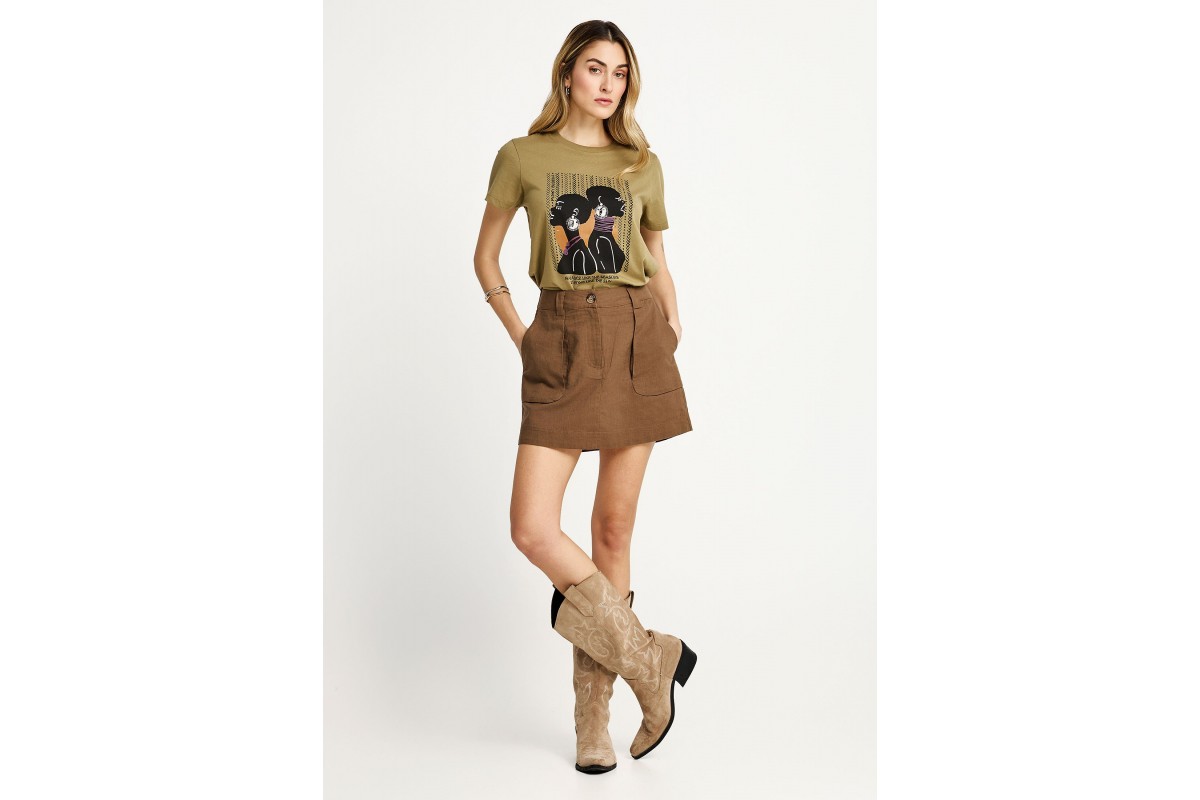 Η λαδί απόχρωση ολοκληρώνει την αισθητική του t-shirt με κομψότητα και διαχρονικότητα, δημιουργώντας ένα ευέλικτο κομμάτι που ξεχωρίζει για την άνεση και την ποιότητά του.