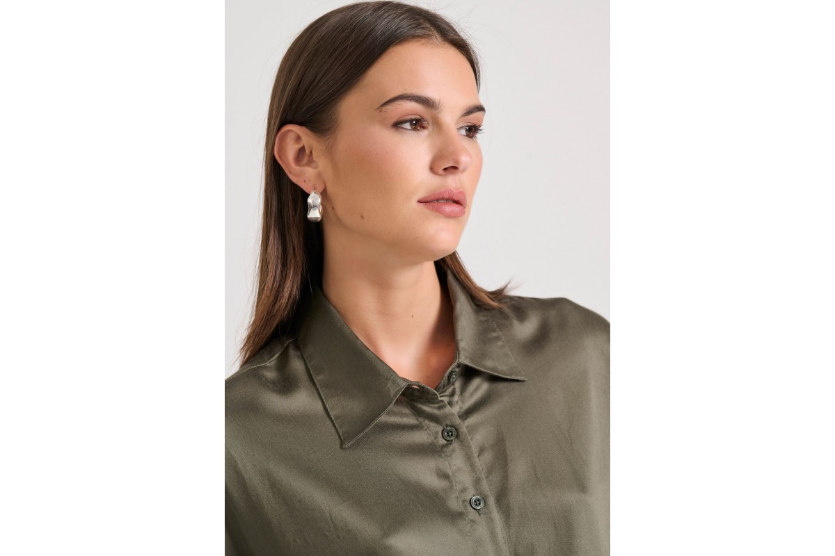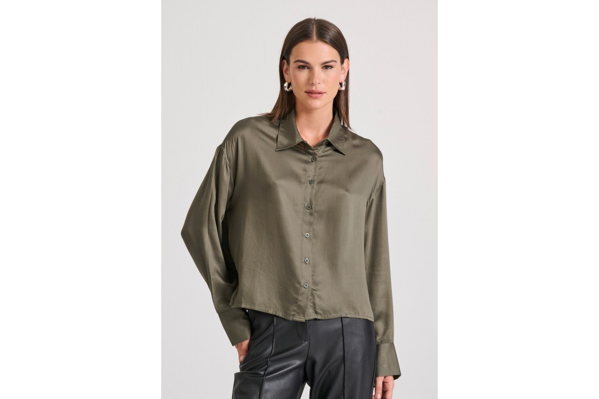 Ανανέωσε το στυλ σου με το Funky Buddha γυναικείο μακρυμάνικο πουκάμισο σε χακί χρώμα, ένα κομμάτι που συνδυάζει κομψότητα και άνεση.