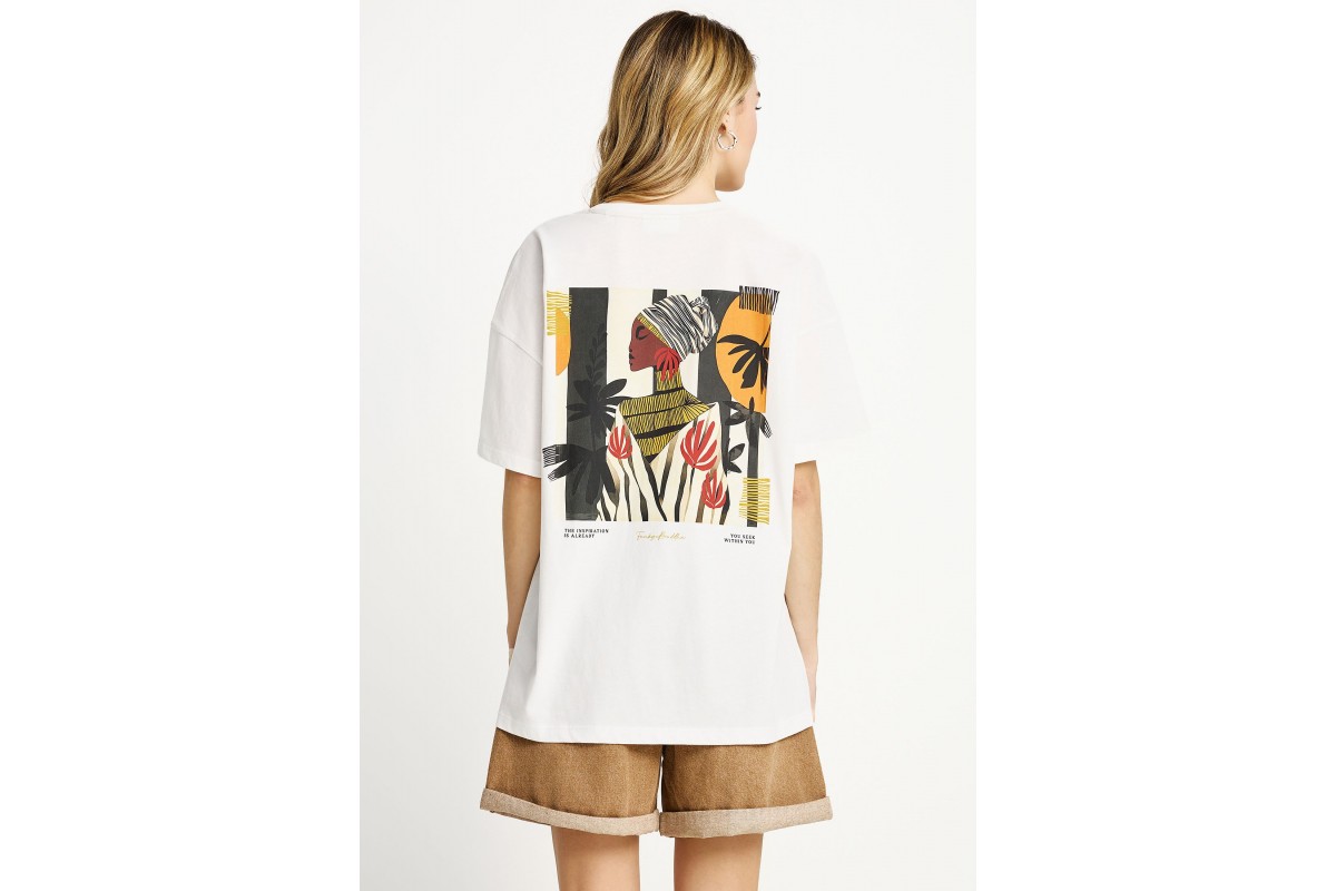 NEW IN! Funky Buddha Loose Fit With Artwork Print Γυναικείο Κοντομάνικο T-Shirt Εκρού