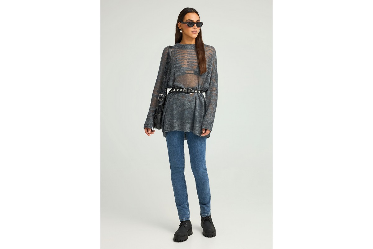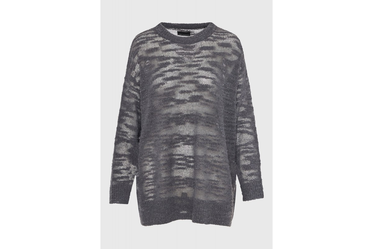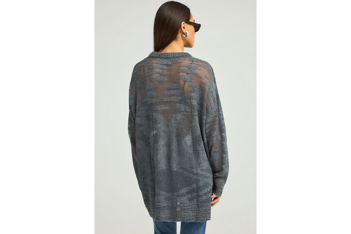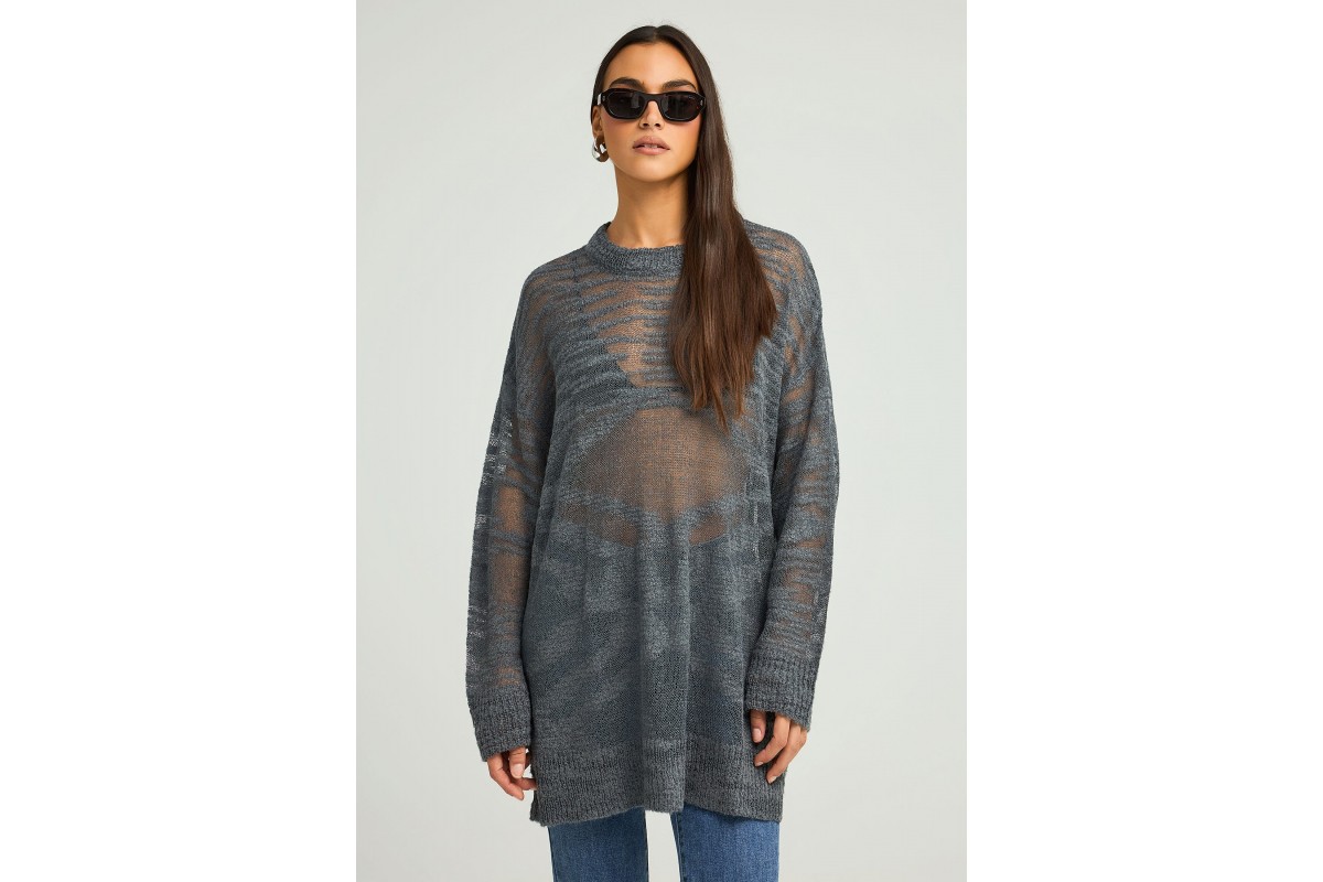 Αυτό το oversized πουλόβερ ξεχωρίζει για την ημιδιάφανη πλέξη του, η οποία δημιουργεί εντυπωσιακό εφέ, παίζοντας με τις διαφάνειες και το μοτίβο ζιγκ-ζαγκ/οριζόντιες γραμμές.