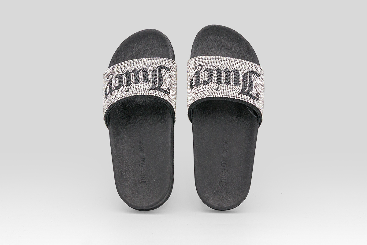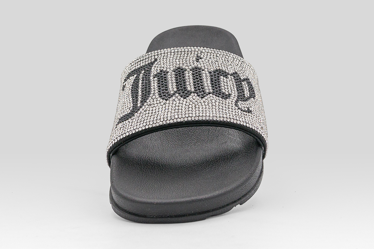 Απόλαυσε άνεση και μοντέρνο στυλ με τις Juicy Couture Diamante Branded γυναικείες παντόφλες σε μαύρο και ασημί χρώμα, ιδανικές για καθημερινή χρήση, παραλία ή πισίνα.