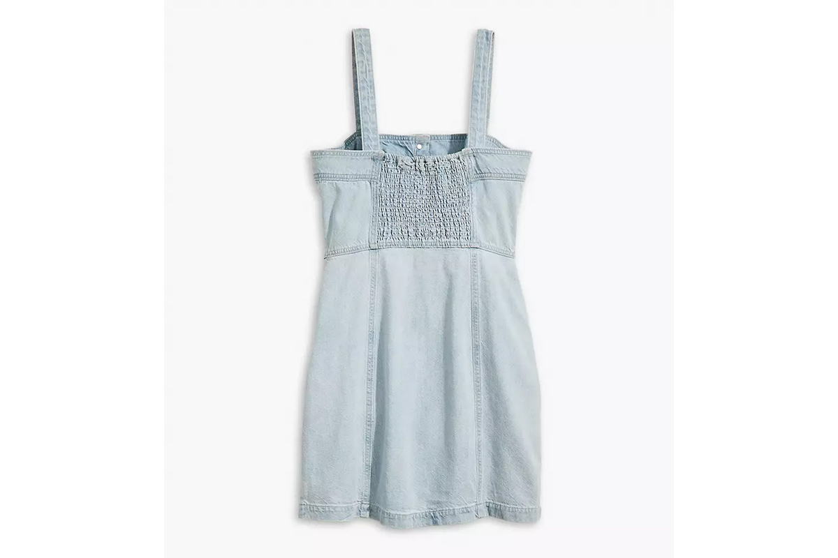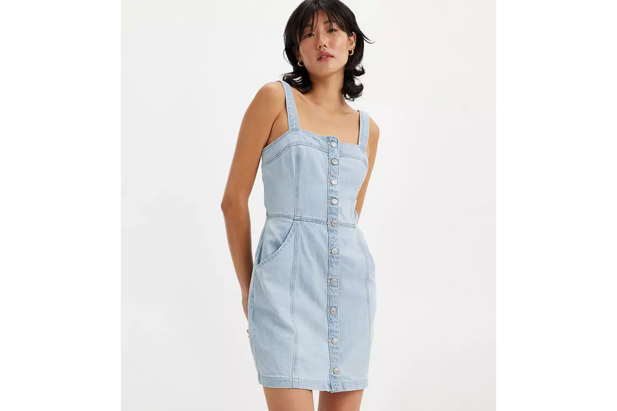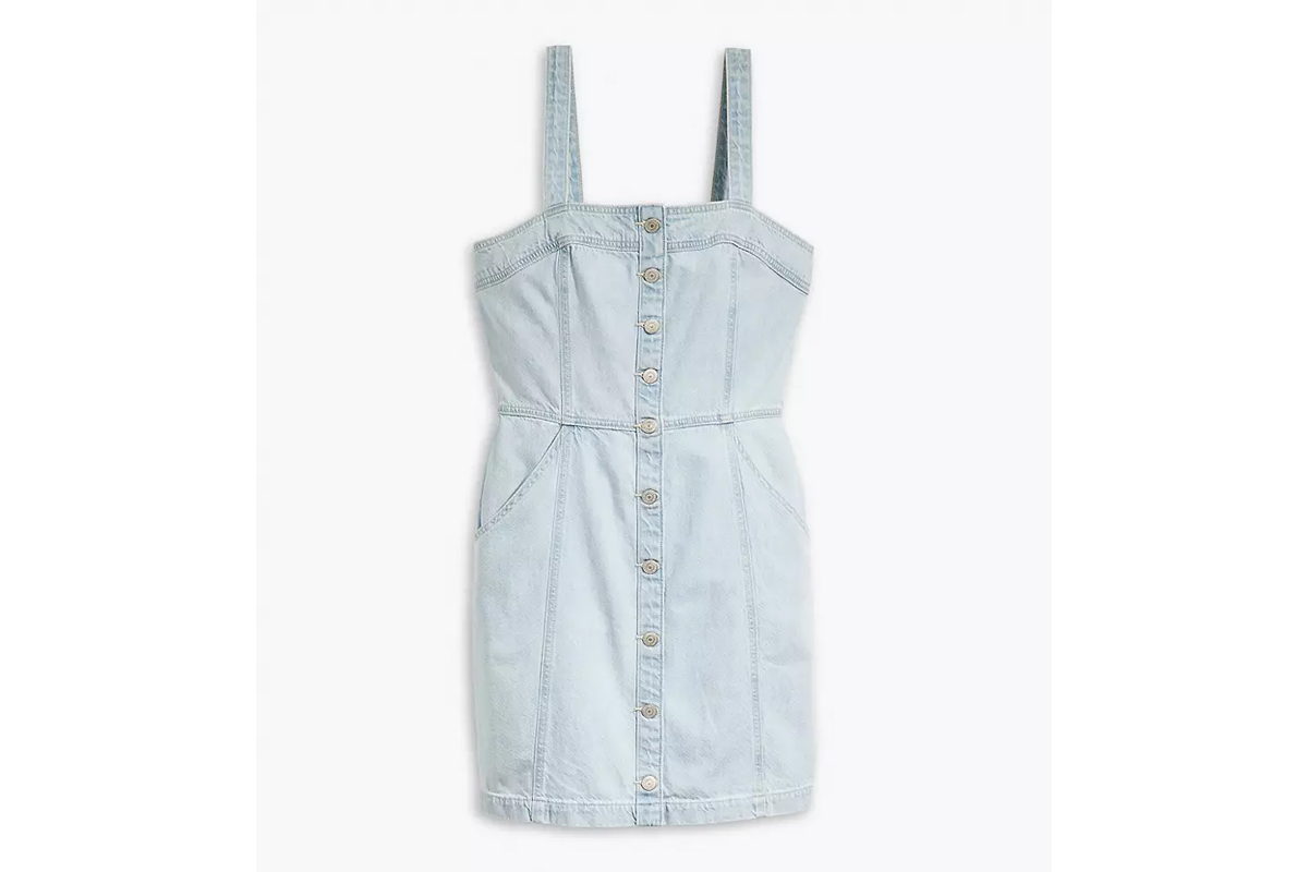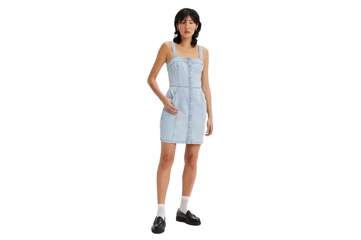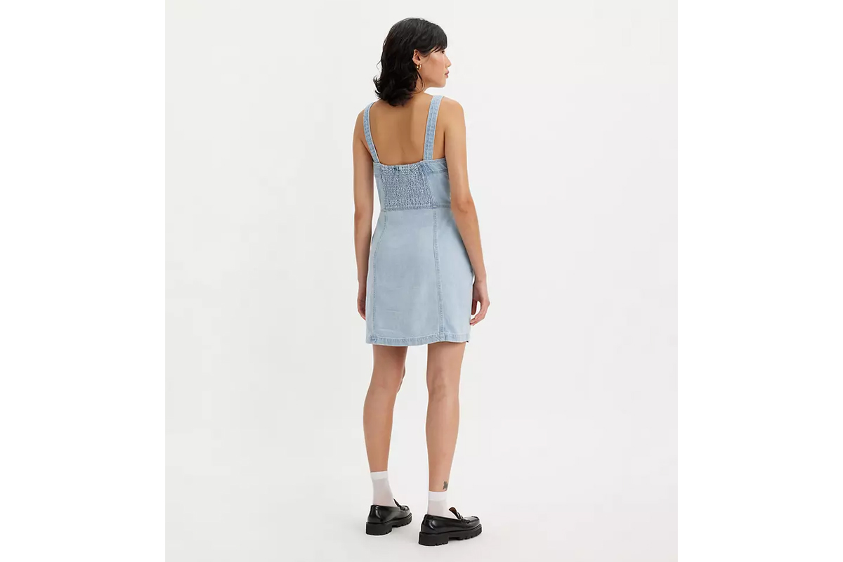 Η μπλε τζιν απόχρωση προσδίδει κλασική και ευέλικτη εμφάνιση, ενώ το mini μήκος του προσθέτει μια νεανική αισθητική. Με σχέδιο εμπνευσμένο από κορσέ, το φόρεμα Drea διαθέτει μίνιεφαρμοστή γραμμήλεπτές ρυθμιζόμενες τιράντες και μπροστινό μέρος με κουμπιά. Για να το ολοκληρώσει, η Levi's πρόσθεσε λεπτομέρειες με κορσέ και δύο πλαϊνές τσέπες.