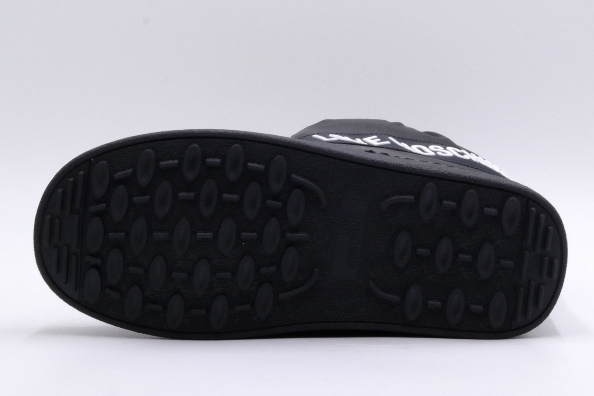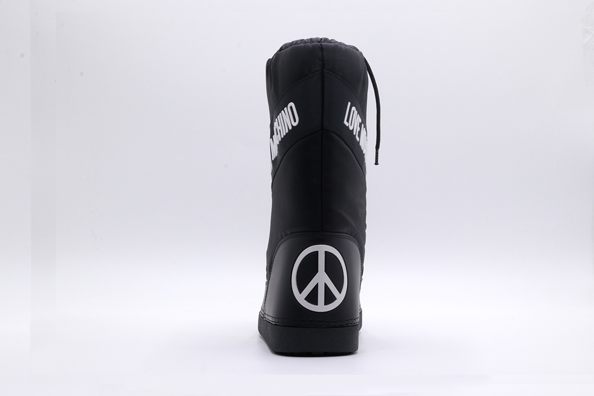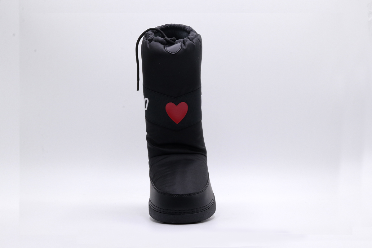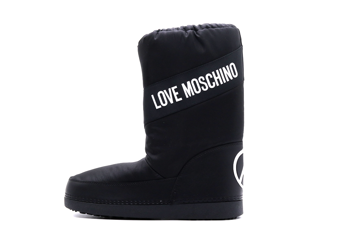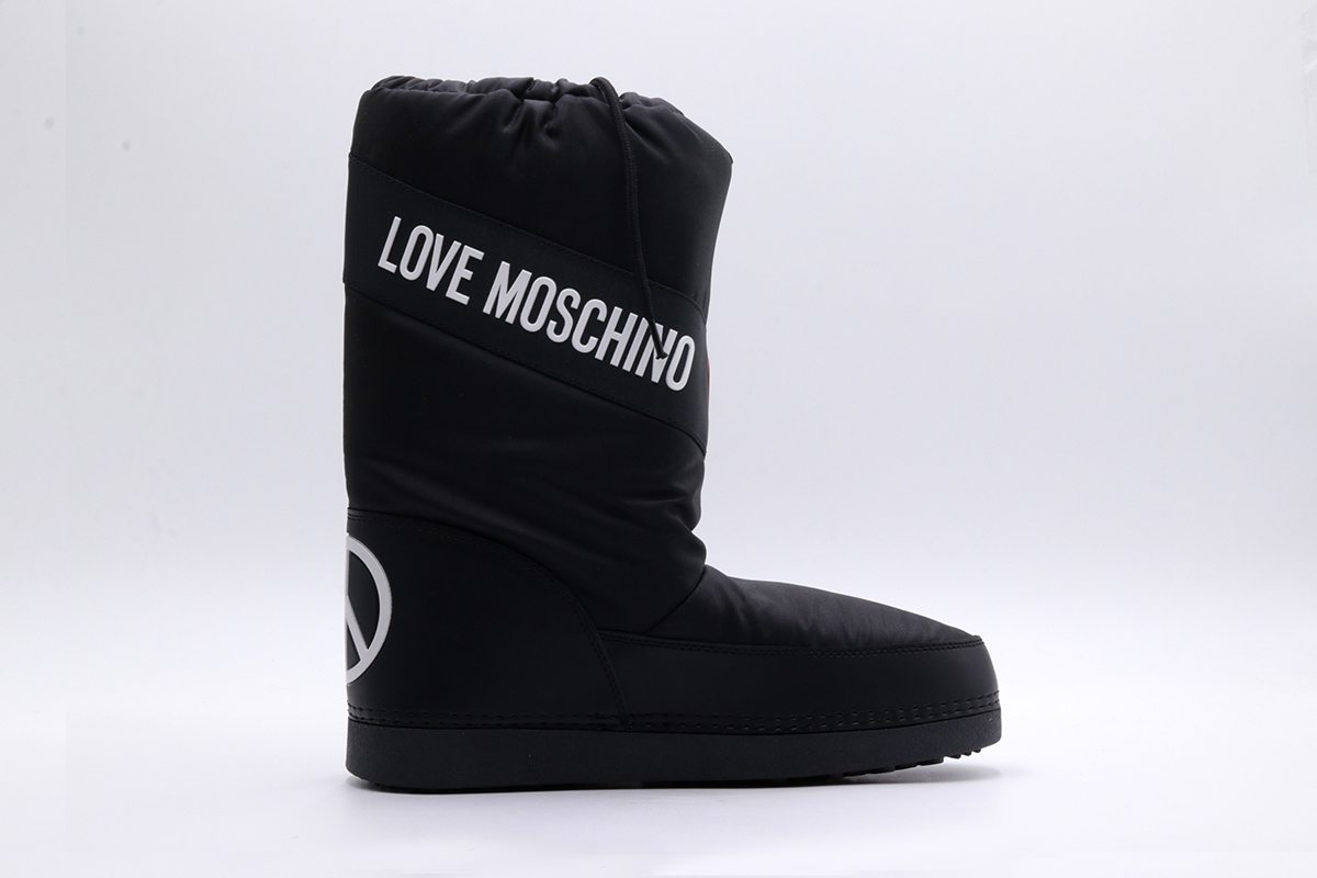 Παπούτσια χιονιού από τη συλλογή Love Moschino κατασκευασμένα από συνδυασμό υφασμάτων και οικολογικού δέρματος. Ένα μοντέλο με λαστιχένια σόλα που είναι ανθεκτική στη φθορά.