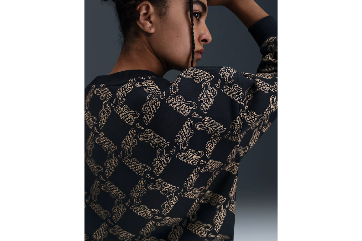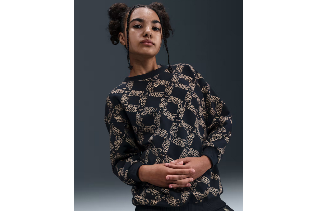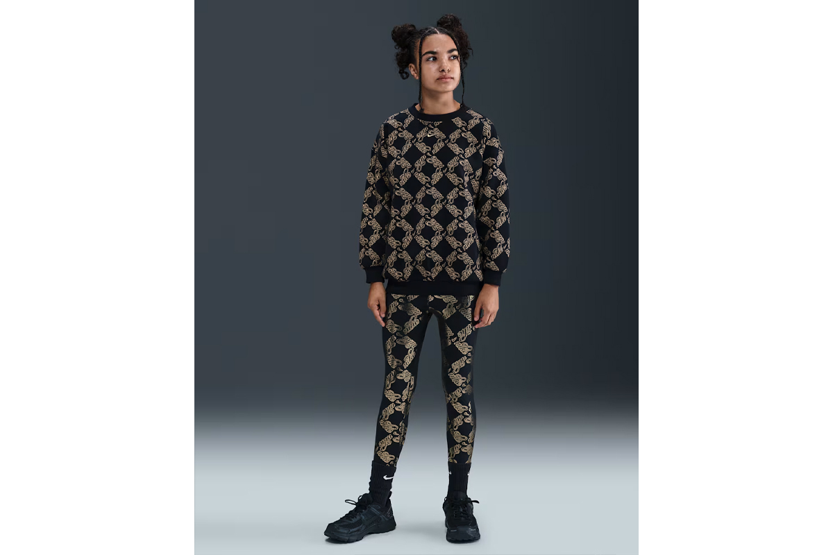 Απόλαυσε άνεση και στυλ με τη Nike Sportswear Club Fleece Printed γυναικεία μακρυμάνικη μπλούζα με λαιμόκοψη σε μαύρο και χρυσό χρώμα, σχεδιασμένη για μεγάλα κορίτσια που θέλουν να ξεχωρίζουν.