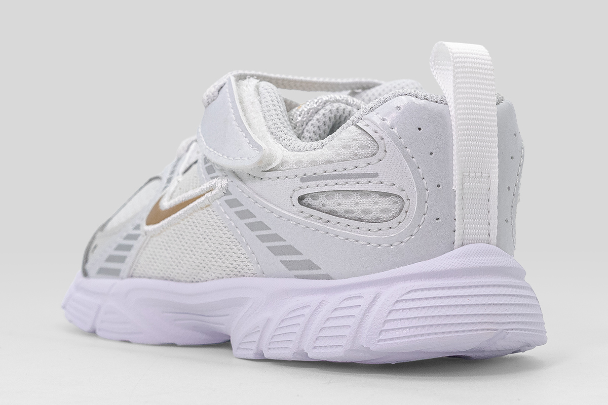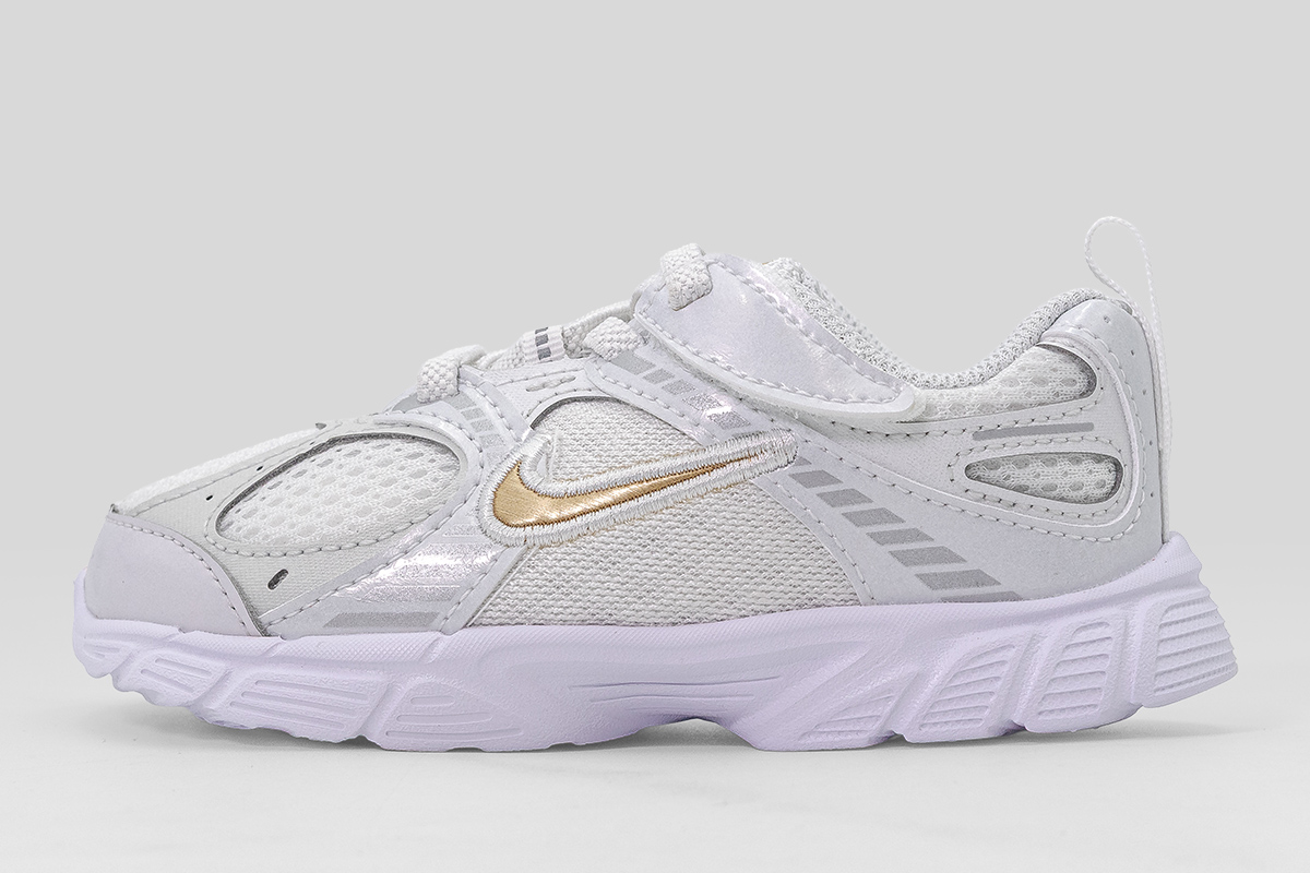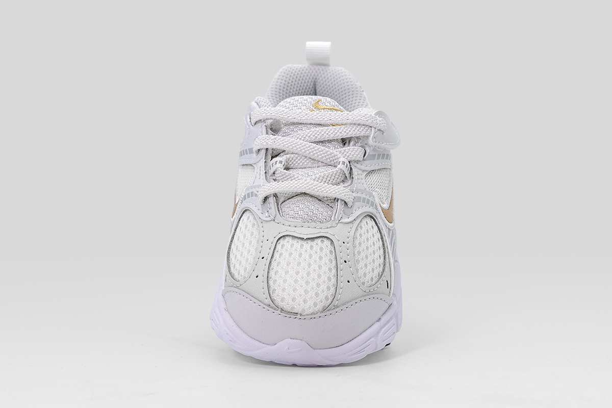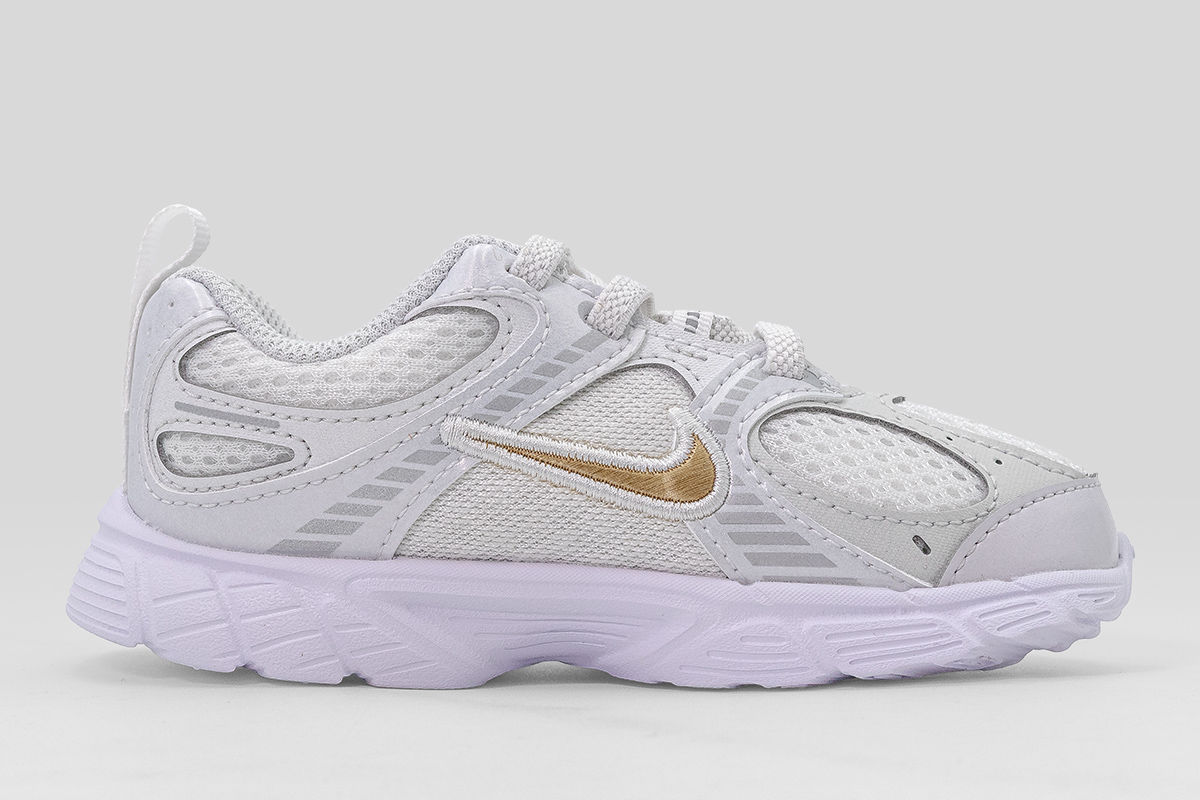 Χάρισε στο μικρό σου άνεση και στυλ με τα Nike V5 RNR βρεφικά sneakers σε γκρι ανοιχτό, χρυσό και λευκό χρώμα, ένα μοντέρνο και πρακτικό παπούτσι ειδικά σχεδιασμένο για τα πρώτα του βήματα.