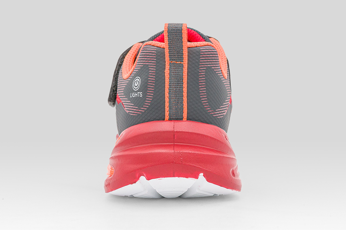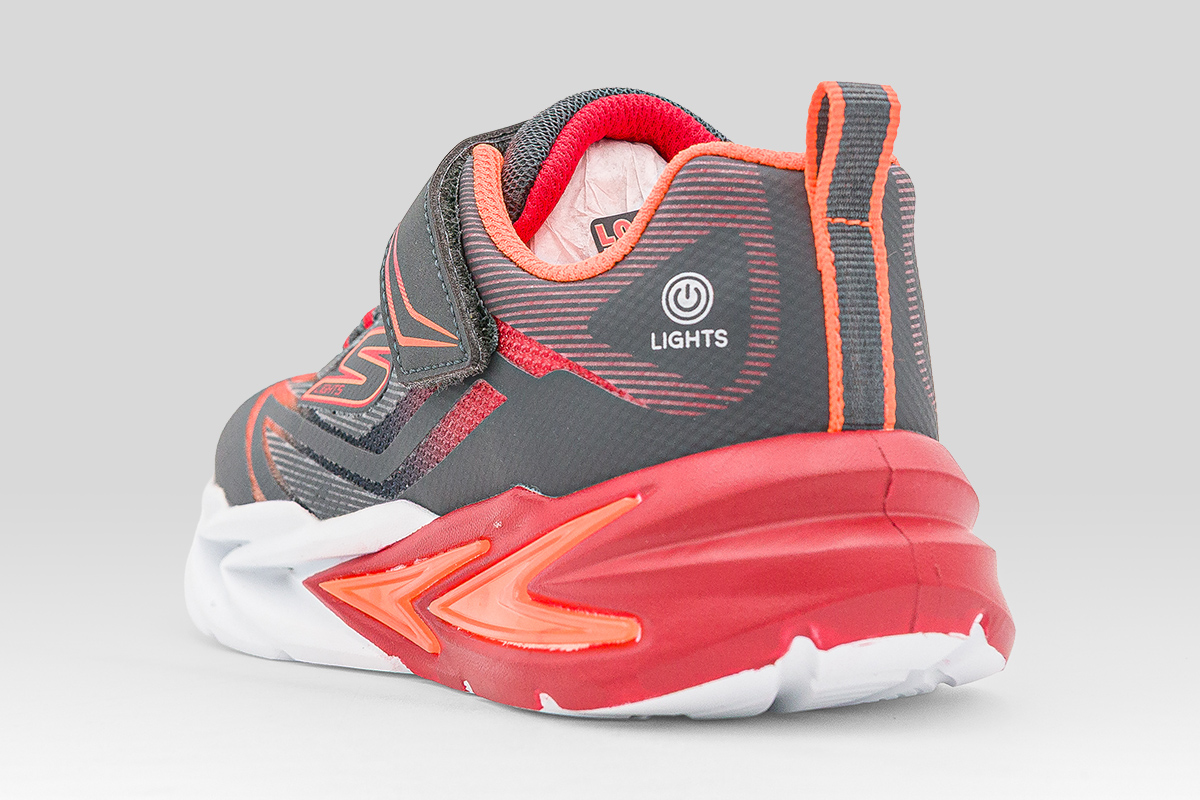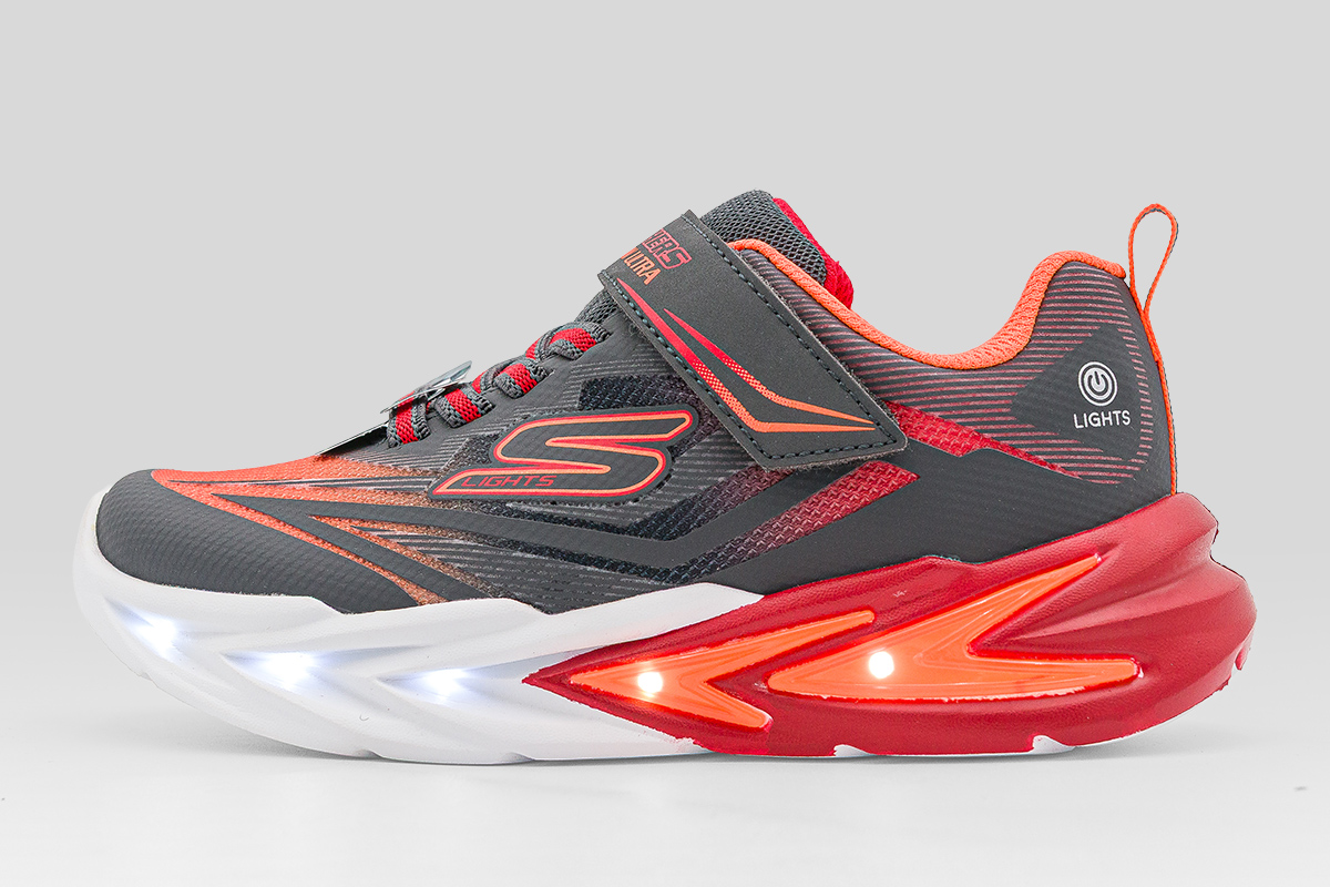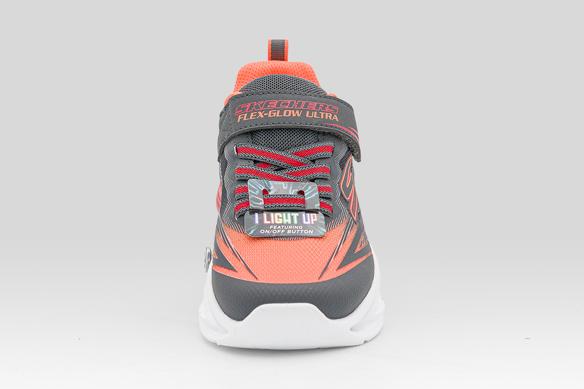 Τα Skechers S Lights Flex-Glow Ultra παιδικά sneakers σε ανθρακί, λευκό, κόκκινο και πορτοκαλί χρώμα γεμίζουν την κάθε μέρα με φως, χρώμα και ατελείωτη ενέργεια.