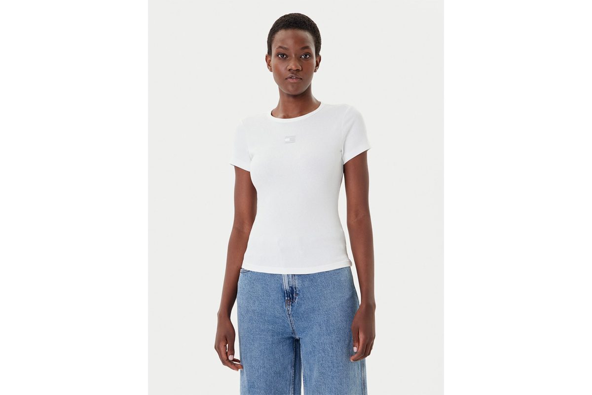 Αναβάθμισε το casual στυλ σου με το Tommy Jeans Badge Ribbed Slim Fit γυναικείο κοντομάνικο T-Shirt σε λευκό χρώμα, ένα κομμάτι που αποπνέει κομψότητα και άνεση σε κάθε εμφάνιση.