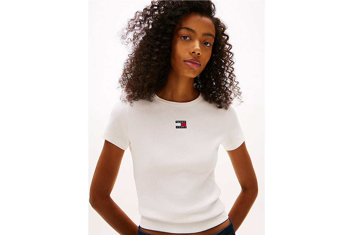 Αναβάθμισε το casual στυλ σου με το Tommy Jeans Badge Rib Slim Fit γυναικείο κοντομάνικο T-Shirt σε εκρού χρώμα, ένα κομμάτι που αποπνέει κομψότητα και άνεση σε κάθε εμφάνιση.